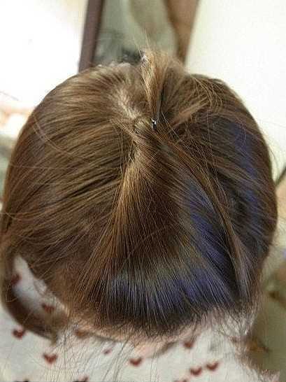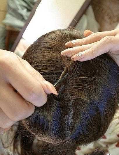 转好后再用发夹将头发往后按在头顶上,然后再用发夹从头顶向下把转好的刘海固定好。