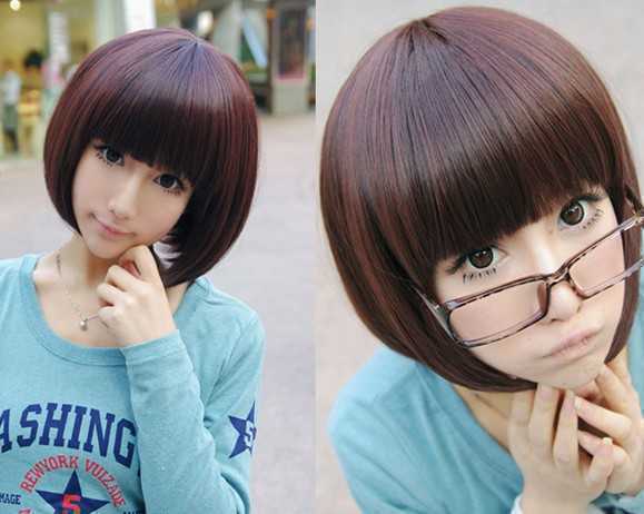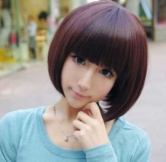 超级可爱甜美的一款韩式的齐刘海BOBO头短发型,齐刘海的打造就是时尚甜美,两颊内扣的发尾有修饰脸型的作用哟!棕红色的发色也是非常的潮流!