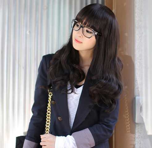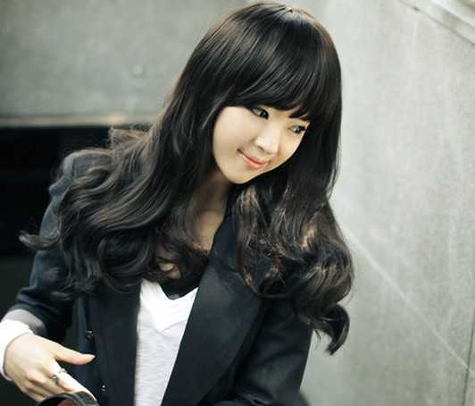 二:齐刘海韩式梨花头深棕色长烫卷发