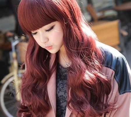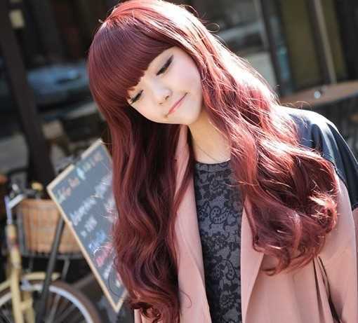 一头酒红色的发色如夏日的火焰一样燃烧着,好有个性,好潮流,有弧度的刘海,甜美气息流露出来,长长的两颊卷发散落在肩上好美哦!
