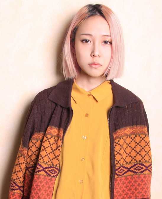 透着酷帅气息的中分发型,短直发,将脸蛋修饰得很漂亮,个性时尚的淡粉色染发,再将一侧头发拨至耳后,增添了几分女人味。