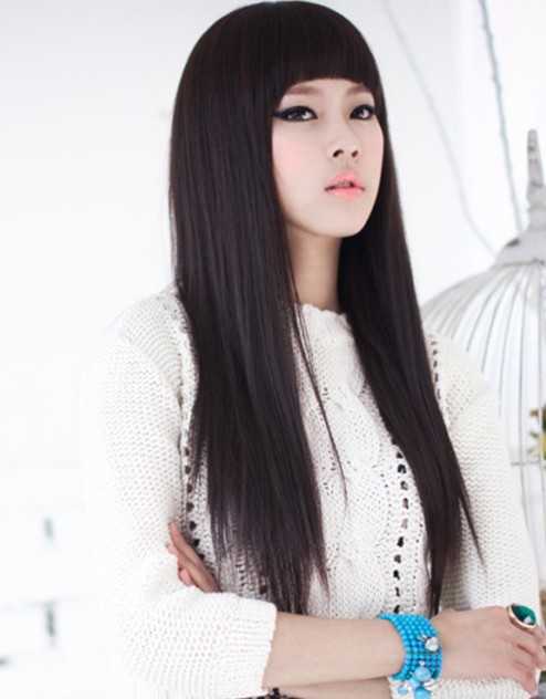 一头乌黑柔顺的长直发,搭在肩上,很美,剪得很短的齐刘海,秀出好看的眉峰,显得整个人都那么精神,在2013年这样的发型也是相当受欢迎的!