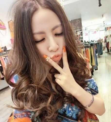 好美的大卷发,层次分明有着厚重的垂顺效果卷发,斜刘海的结合更是完美饰全了女生甜美气息,再以V字形手势和搞怪俏皮的配合,很适合卡哇伊的女生们哦!