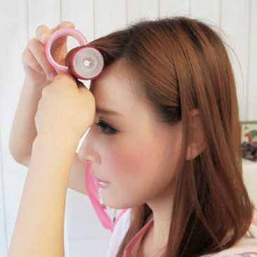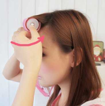 步骤二:一只手将发卷放到刘海下,一只手捏住刘海往上卷。