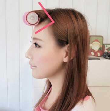 步骤四:扣子扣上后要顺势往内滑,将发卷顶到比较高的位置,这样才能让刘海根部蓬松起来。
