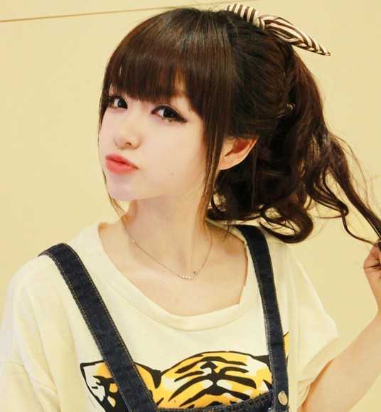 图上的齐刘海发型扎发,完美的把一个可爱的小女生呈现得最好处,薄薄的齐刘海甜美了,再来上一个嘟嘴的表情又变得搞怪起来了,用蝴蝶结松散高扎的头发,自然又不做作感。