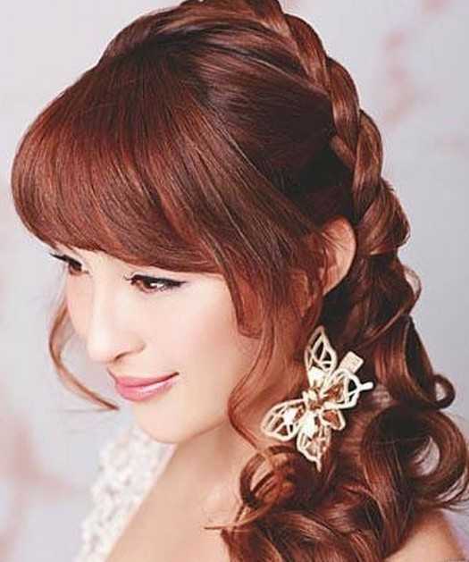 时尚的齐刘海新娘发型,在波浪长发的演绎下别有一番味道,养眼的酒红染发,编发中蝴蝶发饰的点缀,配上动感的刘海卷发丝,使整个新娘造型变得十分清丽唯美。