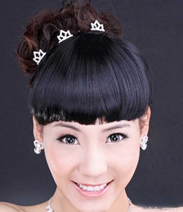 齐刘海新娘发型瞬间提升了甜美可爱度,高高盘起的花苞设计,在三个小皇冠的包围下,小显高贵又不失优雅的气息哦!到精美的妆容,你就是那个最抢眼的新娘啦!