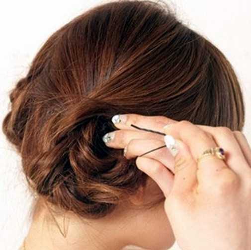 5、然后把拉扯松散的麻花辫沿着耳朵的位置卷曲盘起来,使用小发卡固定好,而另一侧也按照同样的办法进行卷曲,如图所示。