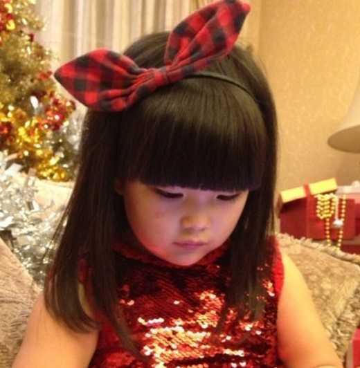 有着小女王范的王诗龄,中长的头发结合着可爱的齐刘海,给人十分甜美爱惜的感觉,大蝴蝶结发箍的装点下,大胖嘟的小脸蛋十分讨人喜欢哦!