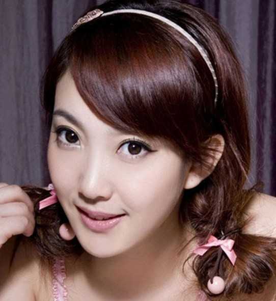韩系的斜刘海侧扎的发型,适合一些比较甜美温婉的女生,稍微显得带点外翻弧形的斜刘海,既可以很好修颜脸型,还能尽显出最可爱俏皮感觉,浅棕色染发给时尚加分哦!