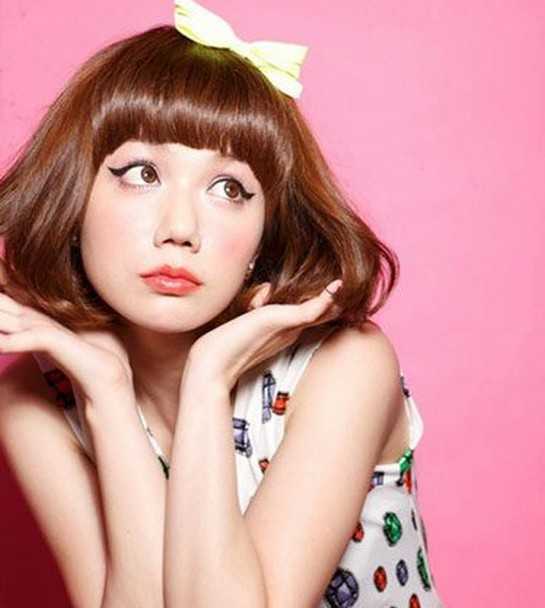 大热的一款时尚的梨花头发型,内扣式的齐刘海设计,完美勾勒出精致立体的小脸效果,棕黄染发搭配蝴蝶结发饰,更显女生俏皮可爱之感!