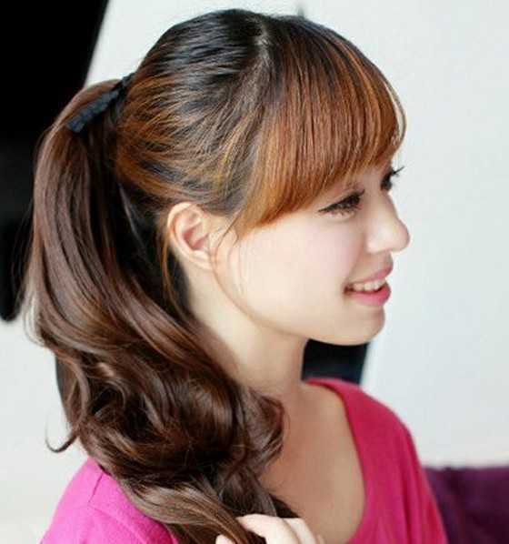 当整齐的刘海配上高扎的马尾发型,将会是2014年甜美俏丽的造型感,稍微的棕黄渐变系的时尚染发,透出女生粉嫩的脸蛋,非常好看!