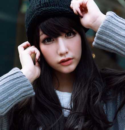 韩式风格,彰显清新范德斜刘海长卷发,2014年最时尚,修颜减龄,凌乱的卷发发丝散落肩上,头顶处的针织帽子,带出潮流。