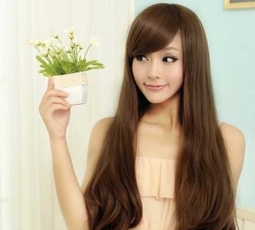 纯黑色长直发清纯简单,搭配简约的斜刘海设计,有着显著的修颜效果,流露出邻家女孩的感觉。