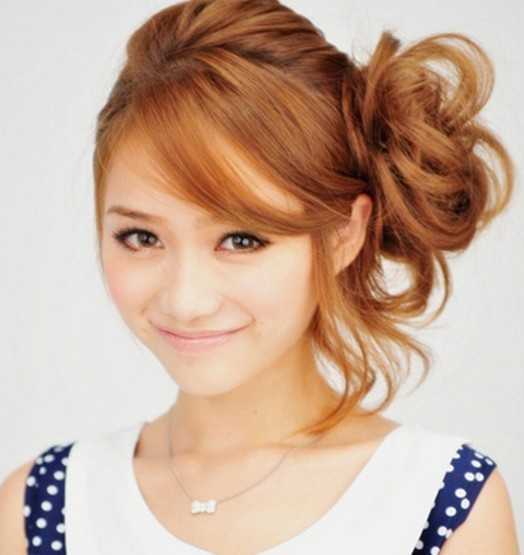 蓬松感简单韩式发型扎发图,棕侧边扎的发髻造型,显露出清爽甜美的淑女范儿,微微贴在额前的斜刘海发束,倍增几分气质度。