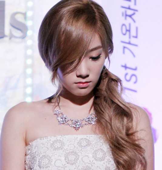 很有名媛范儿的气质韩式发型发型,波浪式的烫卷长发扎发垂落胸前,搭配斜刘海修颜,既是甜美又不失时尚小清新感。