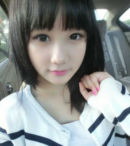 比较适合女学生的一款齐刘海发型,微微侧披肩上的头发,优雅显清新魅力,粉嫩的美妆点缀,十分时尚养眼。
