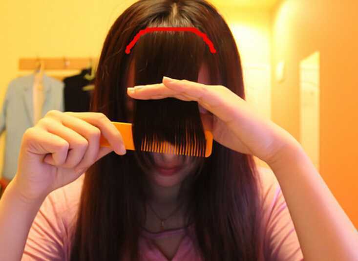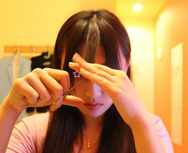 步骤三:分出的刘海分出三小部分,先从中间剪起,长度一定在眉毛以下。