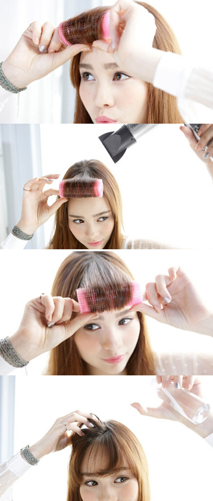 【打理步骤04】如果你是头发较细的女生,最好就利用发卷的时间长些,而发质较粗的女生可以在吹发完成之后将发卷放下,这时空气刘海已经基本成型咯!