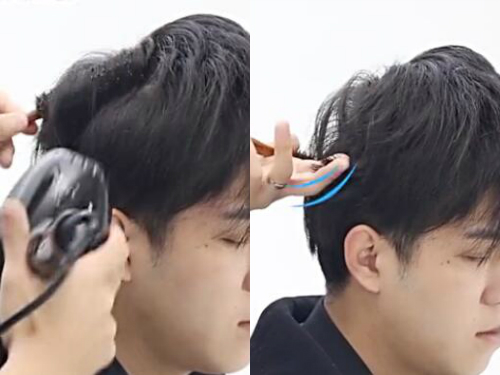 之后将发顶发根吹至蓬松,将刘海吹向一侧,塑造出明显的斜刘海造型。