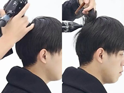 将头发打理得整洁后,先使用电吹风的热风吹顺头发,然后将热风对着发根吹送,塑造出蓬松的造型。