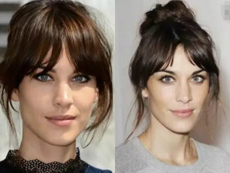 这款齐刘海的打理方法较简单,就是把不长不短的刘海全部捋到一起,然后用发夹夹到头顶上,挑个漂亮的发夹就让发型增色不少哦!但小编觉得这种打理办法不适合长脸妹子,因为额头没有刘海的遮挡,整张脸便会展露出来,那脸长的缺点就没法掩盖了哦。