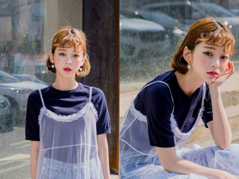 想保留刘海的妹子可以试试这种打理方法,只需用卷发棒把刘海向内卷即可,卷后的刘海长度缩短,就不必担心发丝刺到眼睛了,而且卷曲卷曲的刘海看着凌乱随意,显得特别有个性,其余头发则规规整整的别在耳后,露出女生小巧的脸蛋,俏皮又减龄。