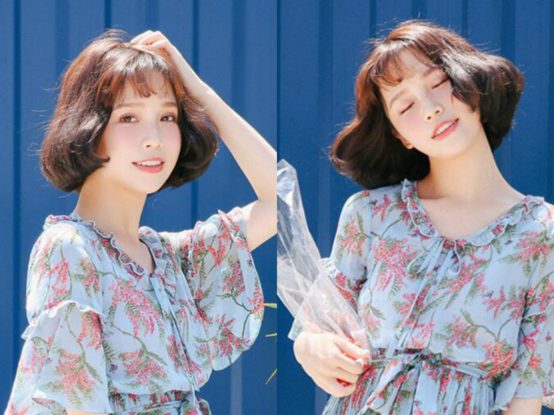 修剪细碎的刘海随意地垂挂在额前,显得空气感十足,发尾的内扣烫发处理像一朵蘑菇,卷起来然后撑开,为妹子增添了一丝俏皮感,修长的脖子线条在极短的发尾衬托下显得很是性感,一不小心就充满女人味。