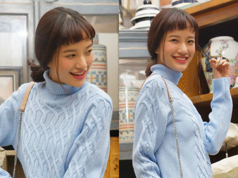 也许大家会觉得脸型长就不应该在留有拉长脸型效果的二次元刘海,要小编说未必哦!同样是把及肩的短发扎成一束低马尾,使脸蛋展露无遗,不规则的二次元刘海恰好挡住一半额头,这样更容易使他人视线集中于妹子的五官上,加上高领毛衣的搭配,哪里还有脸长的情况呢?