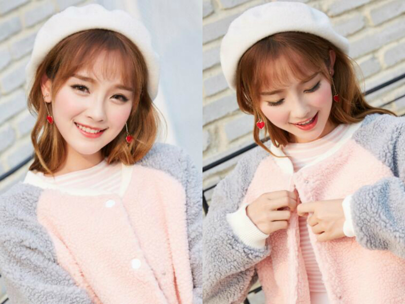 灿若桃花的瓜子脸,配合稀疏透薄温柔的空气刘海,戴上简单的小耳饰,白色的贝雷帽,赋予了妹子优雅清新的气质。
