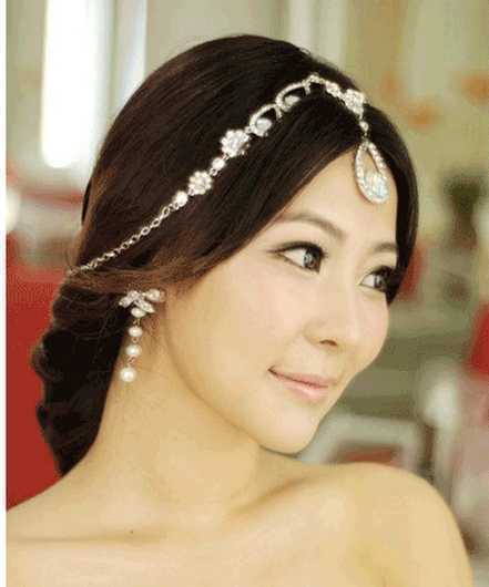 也是一款很甜美优雅的韩式新娘盘发哦,中分不仅显得有点妩媚还可以修饰脸型哦,而且头上的链条装饰看起来也美极了,特别是额前的那颗大大的钻石模样的东西,太美了。