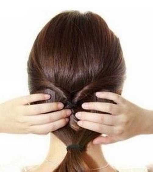 在小马尾和大马尾下方中间的位置轻柔的挖出一个小洞,要小心喔,把头发弄乱就不好看咯。