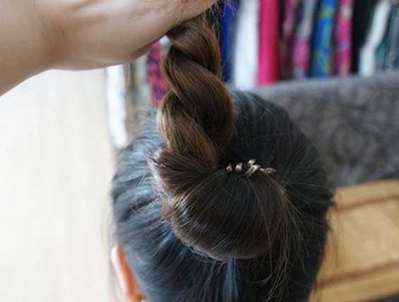 将拧转好的头发绕着橡皮筋拧转,将头发拧成一个花苞的形状。