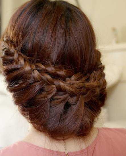 优雅大气的一款盘发,将头发在后面弄成麻花辫再绕成一个弧状盘起,红棕的发色,编成辫子显得特别美,下面蓬松却不凌乱的设计,更显气质。