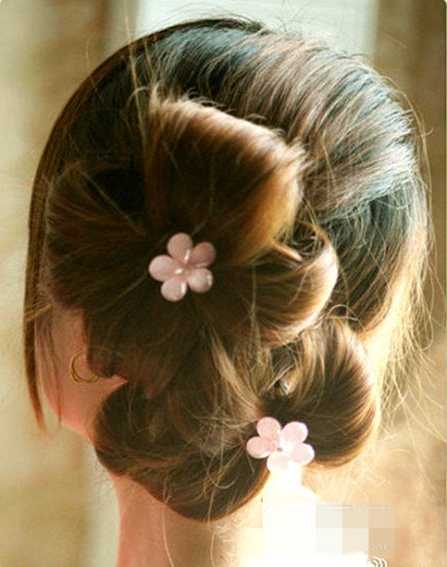 很有特色的一款盘发,优雅,甜美,将头发弄成两朵花形状,再插上花朵的配饰,真美,在秋季也可以感受到春天花开的感觉,这个发型要弄好也要花不少心思哦,要把每个花辫都弄得对称,有难度。