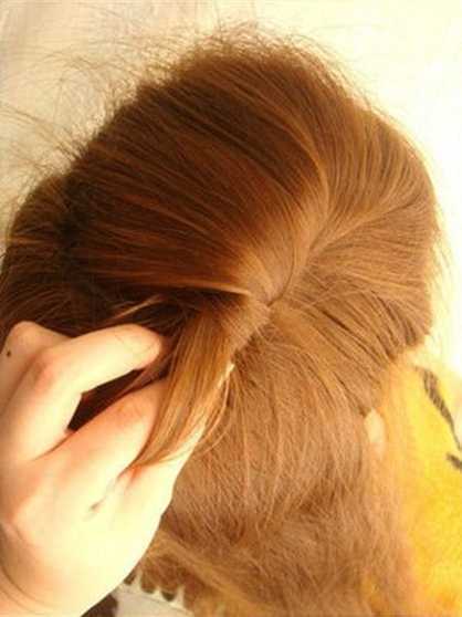 将拿起的头发按顺时针旋转,转几次后用发夹把头发固定在头顶一侧。