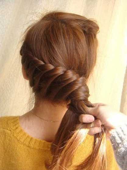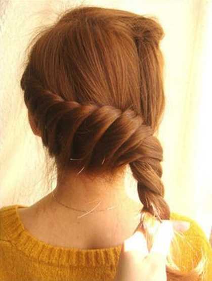转到右下角的时候将右下角的头发也一起放入扭转的头发里,接着往下旋转扭转,转到发尾。