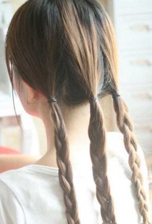 将刚才三条小马尾分别编成小辫子,编的时候可以稍微弄得蓬松一点,