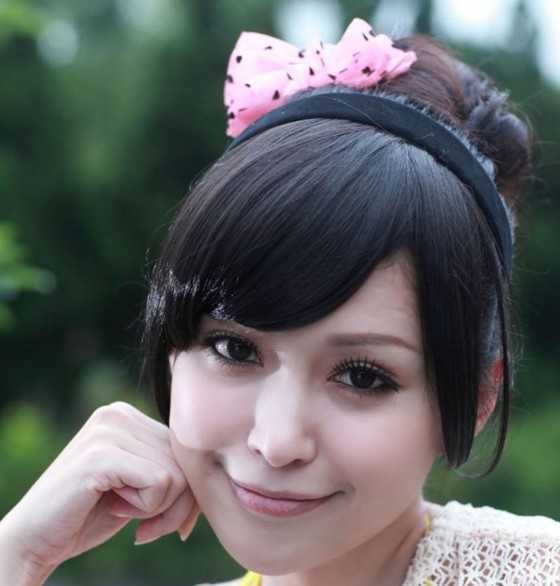 前面的斜刘海的打造真的很甜美哦!而且还有很好的修饰脸型的效果哦!这个盘发的做法也是相当简单哦!只要把后面的头发全部扎起来后,再用一个海绵棒卷绑起来就好咯!也可以在头发上添加一个发饰作为装饰哦!超迷人的!