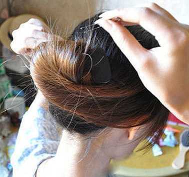 4、用一个夹子扎好,再将两端的头发往外拨,这样可以盖住盘发器。