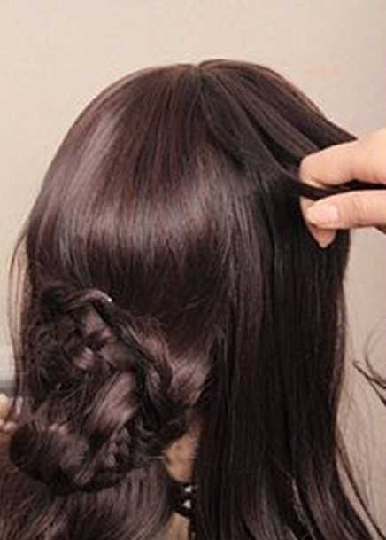 步骤七:弄好了中间部分的头发,现在开始弄两边的头发了,先从头顶一侧拿起一股头发,再将它分成三份,从头顶开始编发。