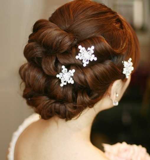 时尚精致的新娘发型新娘盘发,看起来非常唯美,层次感的堆积造型设计,既简洁又不失高贵大方的气质,加入精致的花式点缀,甜美气质悠然而发,是2013最新流行美新娘盘发