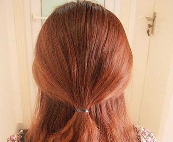 1、把头发打理柔顺后,在后脑勺的半空拿橡皮筋扎出一束发尾。