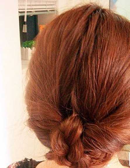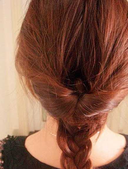 6、然后把麻花辫也一起塞进洞里,注意松散的发丝可使用定型产品将其固定,使头发看起来更柔顺整齐。