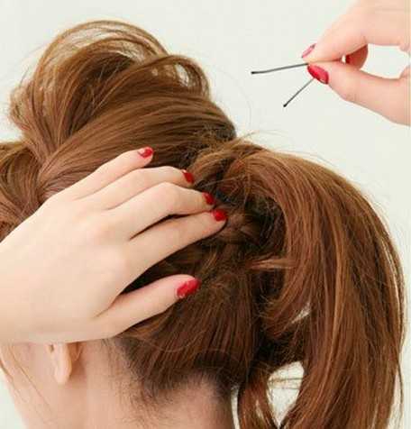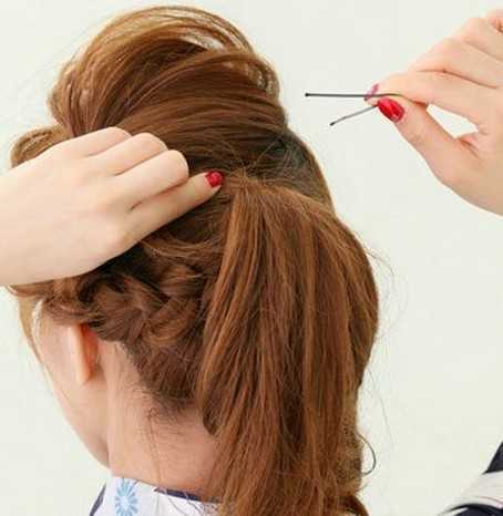 3、然后把编好麻花辫围绕着小马尾使用小发卡来固定好。