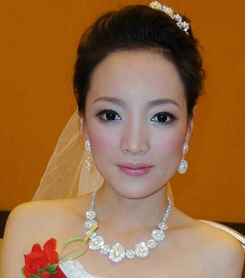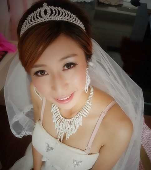 很简约的新娘盘发造型,只需把全部头发往后盘发起的设计,就能体现出清新优雅的感觉,顶部处装饰上一个闪亮的发饰和白纱,粉嫩的妆容,感受到韩式甜美不失大方感觉。