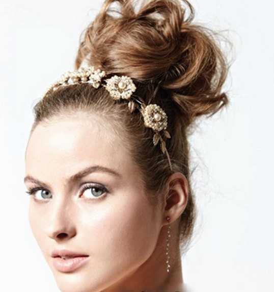 高高盘起的花苞发型,将欧美的新娘子呈现出最清新甜美的一面,松散的花苞头搭配上精美的花朵发箍,露额的设计,既是甜美妆容的体现,还十分的自信大气哦!