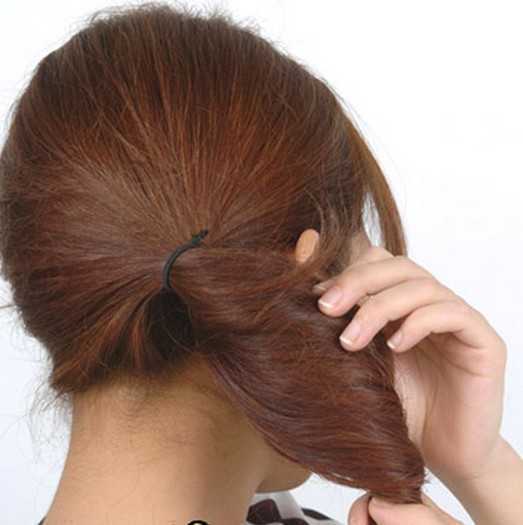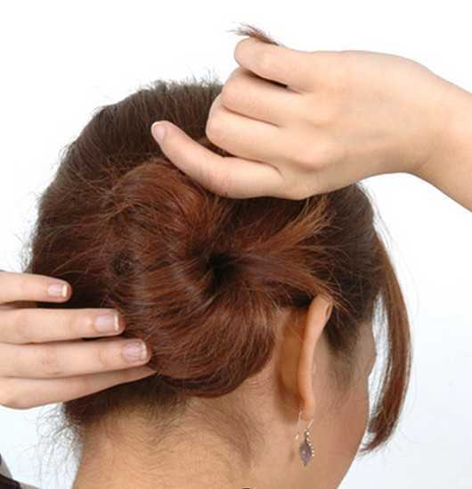 4、然后用手沿着头发根部把马尾盘成丸子头效果。