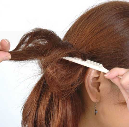 2、使用梳子把马尾倒梳,营造出发量多喝蓬松的效果。